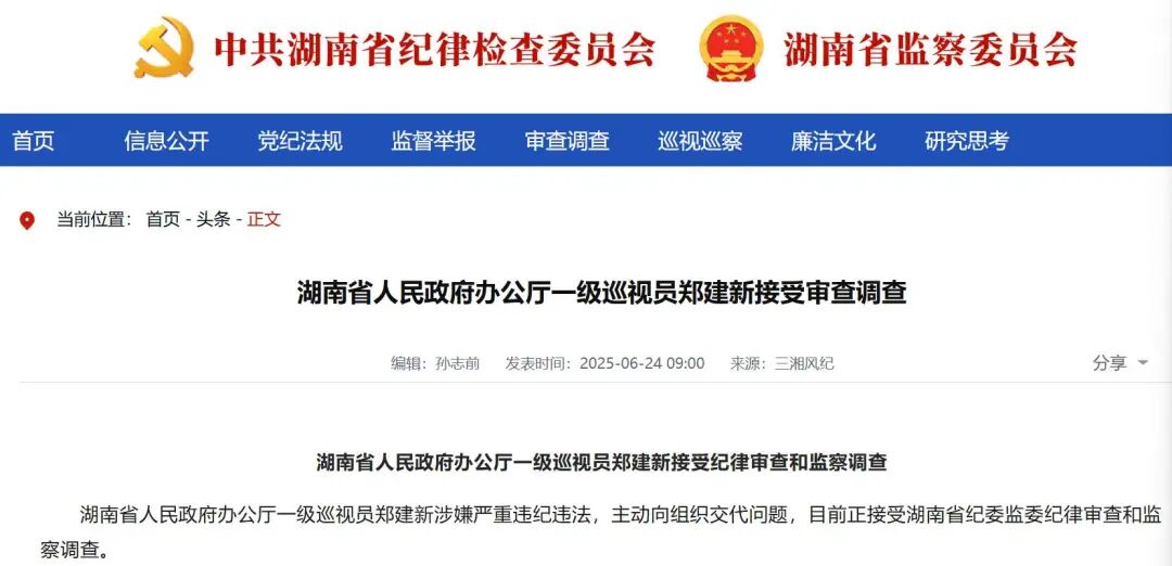 据湖南省纪委监委6月24日消息:省政府办公厅一级巡视员郑建新涉嫌严重违纪违法,主动向组织交代问题,目前正接受审查调查。